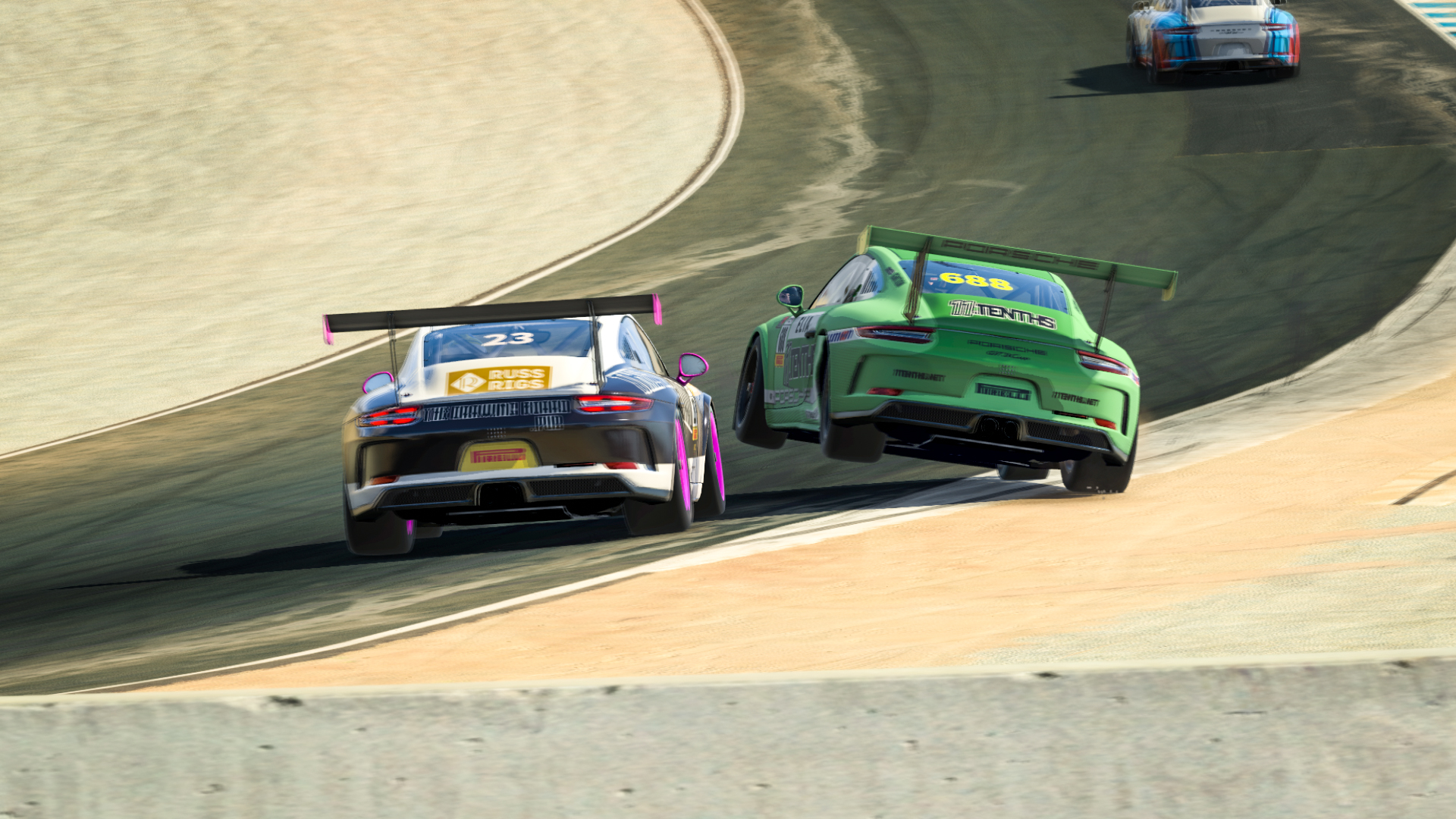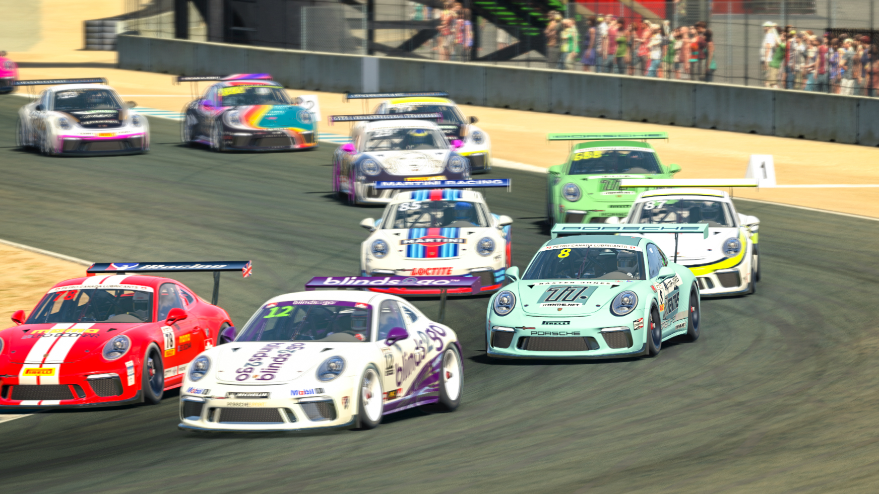 The PCGB Sim Racing paddock made a welcome return to California’s Laguna Seca for rounds 3 & 4 of the championship. The competition in Pro class proved to be tighter than ever with the top 15 cars in qualifying separated by eight-tenths of a second, with 11Tenths driver Mark Baxter-Jones qualifying 4th with teammate Johnny Elia just three tenths back in 14th.